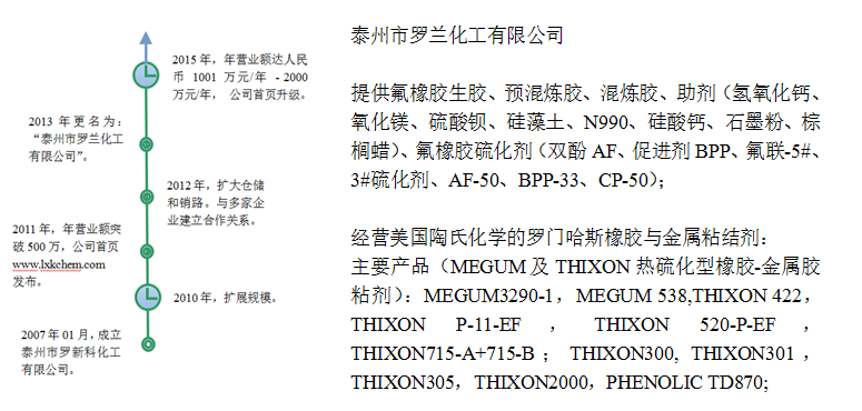 泰州市羅蘭化工有限公司向您提供氟橡膠生膠、預(yù)混煉膠、混煉膠、助劑(氫氧化鈣、氧化鎂、硫酸鋇、硅藻土、N990、硅酸鈣、石墨粉、棕櫚蠟)、氟橡膠硫化劑(雙酚AF、促進(jìn)劑BPP、氟聯(lián)-5#、3#硫化劑、AF-50、BPP-33、CP-50);經(jīng)營(yíng)美國(guó)陶氏化學(xué)的羅門(mén)哈斯橡膠與金屬粘結(jié)劑,主要產(chǎn)品(MEGUM及THIXON熱硫化型橡膠-金屬膠粘劑):MEGUM3290-1,MEGUM 538,THIXON 422,THIXON P-11-EF,THIXON 520-P-EF,THIXON715-A+715-B;THIXON300,THIXON301,THIXON305,THIXON2000,PHENOLIC TD870;